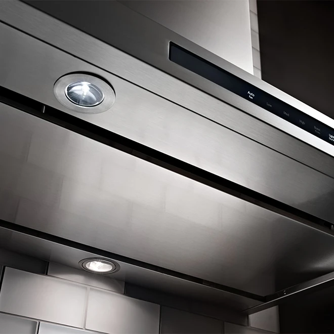 This KitchenAid stainless steel chimney range hood combines sleek style and modern functionality. The perimeter ventilation system efficiently pulls air from the edges of the hood up to a 600 CFM airflow and efficiently clears smoke and odours. Using the Whisper Quiet® system, the wall-mounted range merely produces 1.5 sones at slow speed, allowing you to leave it on even while eating. The electronic glass touch controls make it easy to select one of the 3 venting speeds. The auto-speed setting automatically adjusts the fan speed to protect the cabinets while the sleep mode turns off the fan after 10 minutes of inactivity. The range can easily be converted into an in-line blower installation for a more quiet installation or even into a non-ducted range using a recirculating kit including a charcoal filter (sold separately)