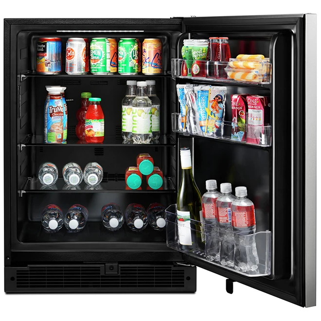 This Whirlpool(TM) refrigerator is designed to be installed under the counter. Store food and beverages the way you like them with customized temperature selection ranging anywhere from 5 to 17.7°C (41 to 64°F). Keep items at their ideal temperature with an alert that lets you know if the temperature is rising or cold air is escaping through an open door. Choose the ideal temperature with convenient, up-front controls. The LED interior lighting keeps food looking as good as it tastes. Get a clean, streamlined look that complements any suite of appliances with the towel bar handle. The reversible stainless-steel door accommodates unique spaces. Hide fingerprints and smudges with stainless steel that easily wipes clean. The refrigerator is backed by a 1-year limited warranty on parts and labour. It is also backed by a 2nd – 5th year limited warranty on cavity liner and sealed refrigeration system.