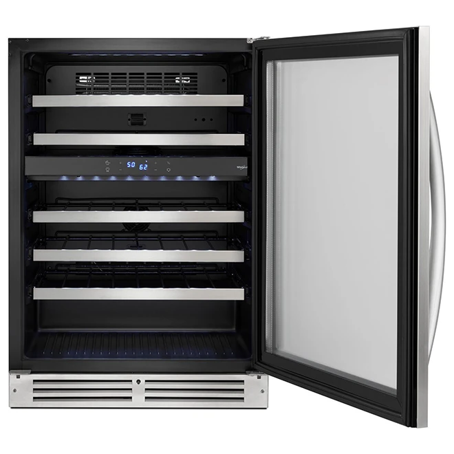 This undercounter wine cellar from Whirlpool lets you store up to 46 bottles of wine and offers two temperature-controlled zones so you can conveniently keep wine on the lower racks at 50-64°F and other beverages above at 41-50°F. Your drinks will look as good as they taste with beautiful LED lighting, while electronic temperature controls located in the front make it easy to set the perfect temperature. The glass door with stainless steel can be installed on either side for more convenience and an alert lets you know if the temperature in your refrigerator is rising or if cold air is escaping through an open door. The racks offer durability and an elegant look with their metal fronts.