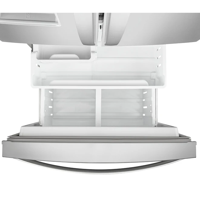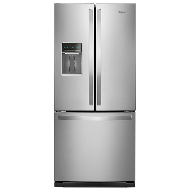 A slimmer design ensures this Whirlpool French door refrigerator fits in seamlessly with your kitchen space while providing great usable space. It has great features such as integrated LED lighting, a FreshFlow air filter eliminating bad odours as well as purposefully designed zones that provide better organization to let you store more grocery items. In addition, it includes a built-in filtered water and ice dispenser as well a quick-cool feature that temporarily provides cooler air inside the unit. Fruits and vegetables stay fresher for longer in humidity-controlled crispers, and the tuck shelf provides space for taller items, including 4-litre bottles. The stainless steel finish is fingerprint-resistant and gives your kitchen an aesthetic, professional style. Backed by a 1-year limited warranty, parts and labour.