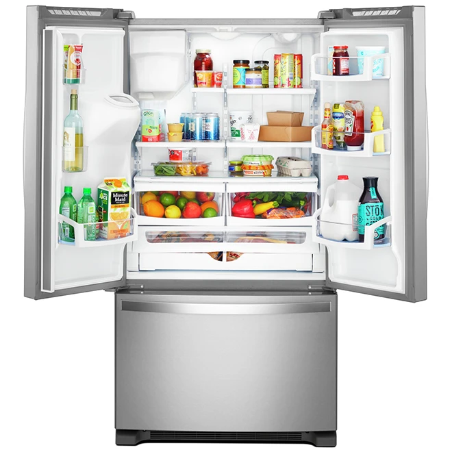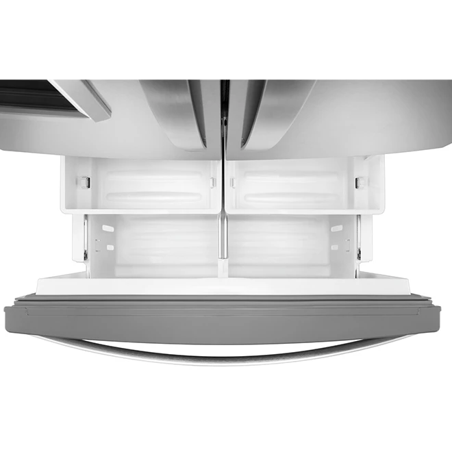 This Whirlpool counter-depth will fit flush with your cabinets and will be a great addition to any kitchen. The refrigerator features a fingerprint-resistant stainless steel exterior with beautiful French doors. It is equipped with an exterior water and ice dispenser that includes the EveryDrop filtration technology, for pure and fresh water and ice without needing to open the doors. This appliance also offers a fast cool option which quickly lowers the refrigerator’s temperature with the push of a button to keep it optimal when you are placing fresh groceries in it, and it is also equipped with multi-level LED lighting, which provides great visibility. Additionally, the spillproof glass shelves help contain any eventual spills for an easier clean up! The freezer also has plenty of awesome features, such as an adaptive defrost function that automatically monitors the freezer’s environment and runs the cycle only when necessary to save energy, an easily organizable storage space thanks to the Two-Tier sliding bins, as well as a factory-installed Icemaker to make sure that you always have ice cubes ready for your guests or yourself. This product is backed by a 1-year limited warranty on parts and labour.