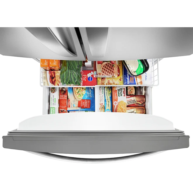 Make room in your kitchen and welcome this Whirlpool French door refrigerator. This 33-inch appliance with a fingerprint resistant stainless steel finish will add a modern twist to your decor, but will mostly meet all of your expectations. It has a capacity of 22 cu ft, which means you can go grocery shopping without having to worry about storage. It features several functionalities such as the Accu-Chill system, which monitors the temperature and adjust it to keep a cool temperature throughout the day. There is also an adaptive defrost system that provides food preservation by running the defrost system only when necessary, which also means you will save 12% more energy. This Energy Star refrigerator also comes with the FreshFlow produce preserver to keep your fruits and vegetables fresh for as long as possible. To keep everything well-organized, it features adjustable frameless shelves as well as door compartments, in which you can put taller items such as milk or juice. Moreover, the LED lighting will keep your food as good-looking as it tastes.