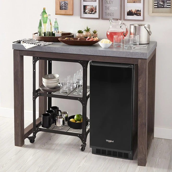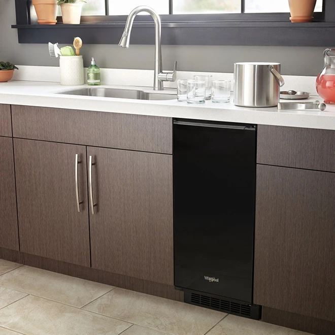 This Whirpool icemaker features a venting system that gives you the flexibility of installing it under a counter or on its own. It can hold up to 25 lb. of ice and has a Fast Ice option to speed up ice production. This appliance is easy to clean, and will notify you when it’s time to run the self-clean cycle to minimize mineral scale buildup. The freezing process ensures ice that’s free of air bubbles and impurities. This appliance has a reversible door as well as electronic touch controls and LED lighting.