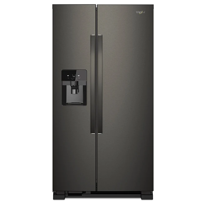 Do you want a great side-by-side refrigerator featuring touch controls and a beautiful black stainless steel exterior? This model by Whirlpool is the perfect choice for any modern kitchen. The freezer features an adaptive defrost system that saves energy by running the cycle only when necessary. Plus, it is equipped with an exterior water and ice dispenser. This appliance offers plenty of storage options, including 4 frameless glass shelves, a deli drawer, 3 adjustable door bins, a humidity-controlled crisper, and a can caddy. It comes with a 1-year limited warranty.