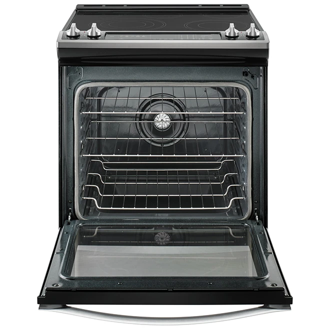 This Whirpool electric range is a great, long-lasting appliance. Its stainless steel finish is sure to fit with your kitchen decor. This model features 5 top quality burner elements, which deliver up to 3000 W of cooking power to handle nearly any cooking task. Furthermore, a temperature sensor automatically monitors and adjusts the cooking elements to help you get perfectly cooked food. The true convection cooking system cooks food faster by using a 3rd element and a fan to distribute hot air over, under, and around food. You’ll get consistent cooking results every time! What’s more, Frozen Bake technology allows you to skip the preheating step. Plus, say goodbye to the hassle of cleaning: this appliance comes with a self-cleaning function that removes stubborn residue from oven racks and walls in as little as 50 minutes. Simply turn on the self-clean option and relax. This range even comes with a 1-year limited warranty for peace of mind.