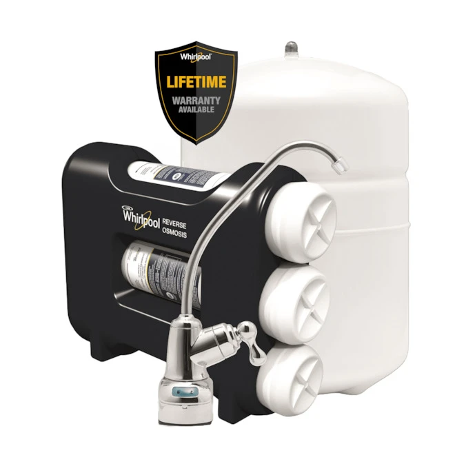 Included :1 reverse osmosis system, 1 chrome-plated faucet, 2 filters, 1 membrane, tubing and a battery